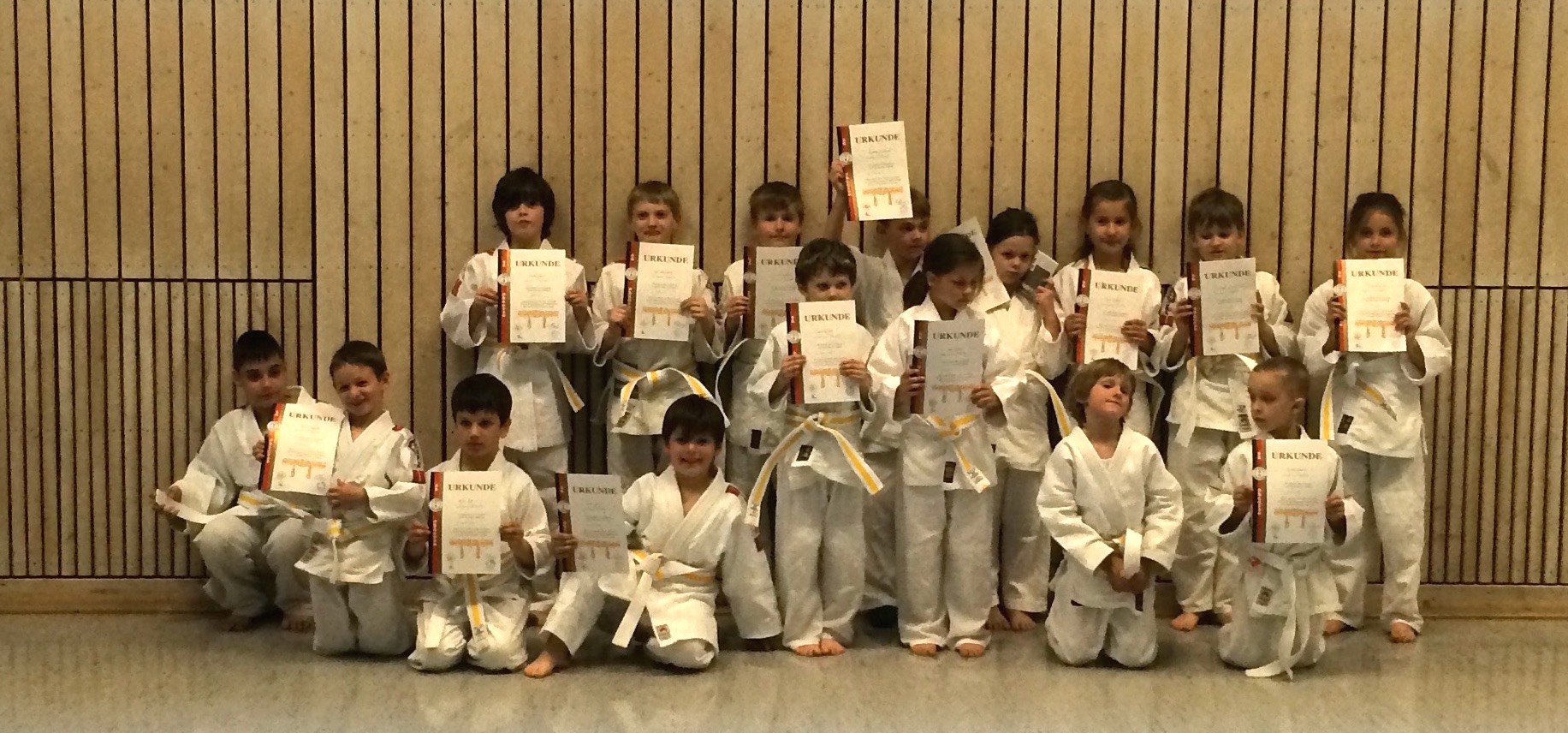 GürtelprüfungDie Kinder der Donnerstags Gruppe "Anfänger-Gruppe" nahmen an der Gürtelprüfung zum weiß - gelben Gürtel teil. Bei der Prüfung zum 8 kyu - Grad muss man bereits in allen Prüfungsfächern Fallschule, Stand und Boden sein können unter Beweis stellen. Die Fallschule Rück und Seitwärts sowie die Würfe O Soto Otoshi und Uki Goshi gehören zum Pflicht Programm. Im Boden müssen zwei Haltegriffe und Befreiungen gezeigt werde. Nach der Wochenlangen Vorbereitung haben alle Teilnehmer die Prüfung bestanden und sind nun verpflichtet dein weiß - gelben Gürtel zu tragen. Herzlich Glückwunsch an alle Prüflinge zur bestandenen Prüfung